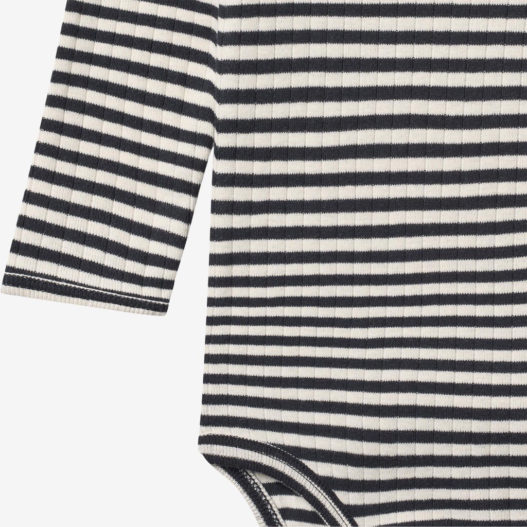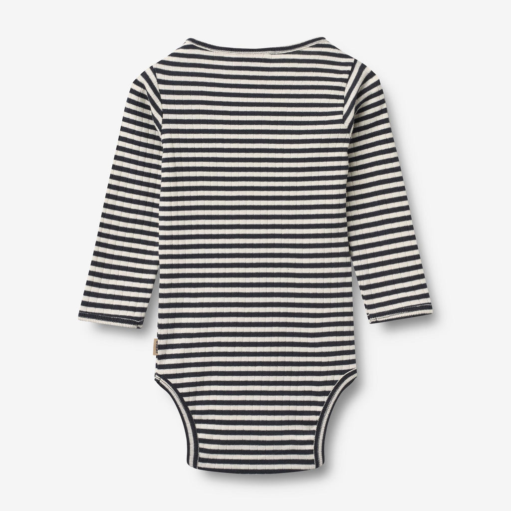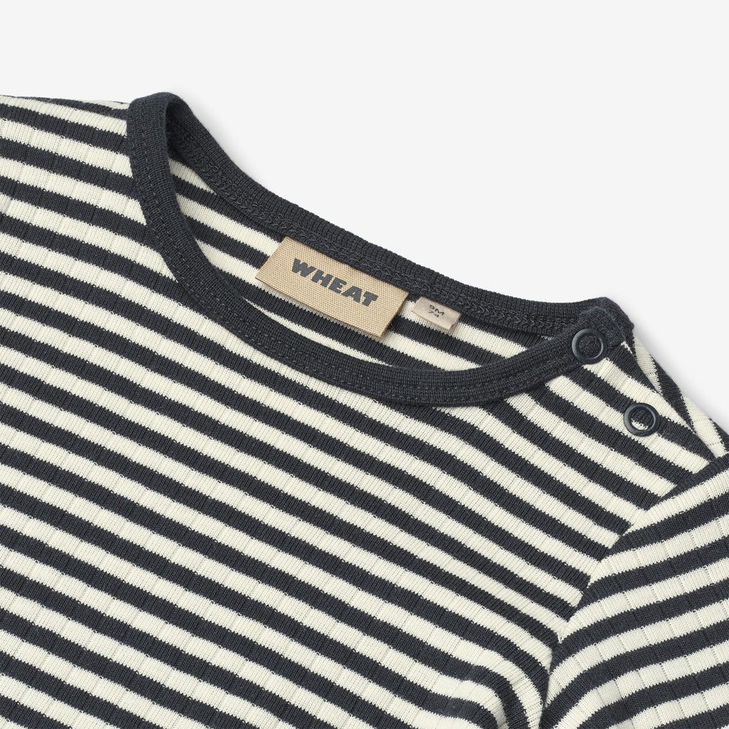 Langærmet rib body med striber i blødt økologisk bomuld til din baby.- Ribstruktur- Tæt pasform- Kontrastfarve ved alle åbninger- Trykknapper på den ene skulder- Trykknapper i bunden ved benene- StribetWheats basis body er en sand klassiker i garderoben, når det kommer til småbørn. Denne body har trykknapper på den ene skulder samt i bunden for bedre komfort, når du skal klæde dit barn på. Brug bodyen som den inderste del i ethvert outfit, da den er blød at have tæt på huden.