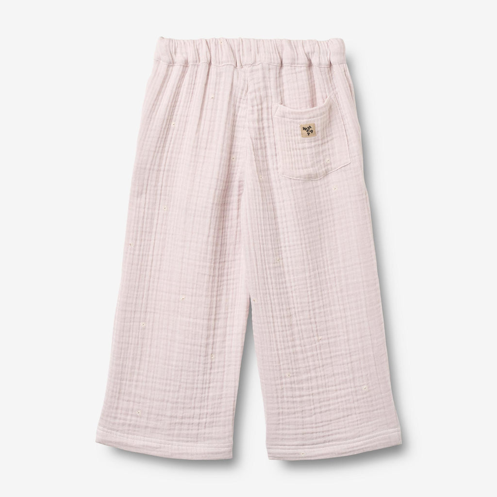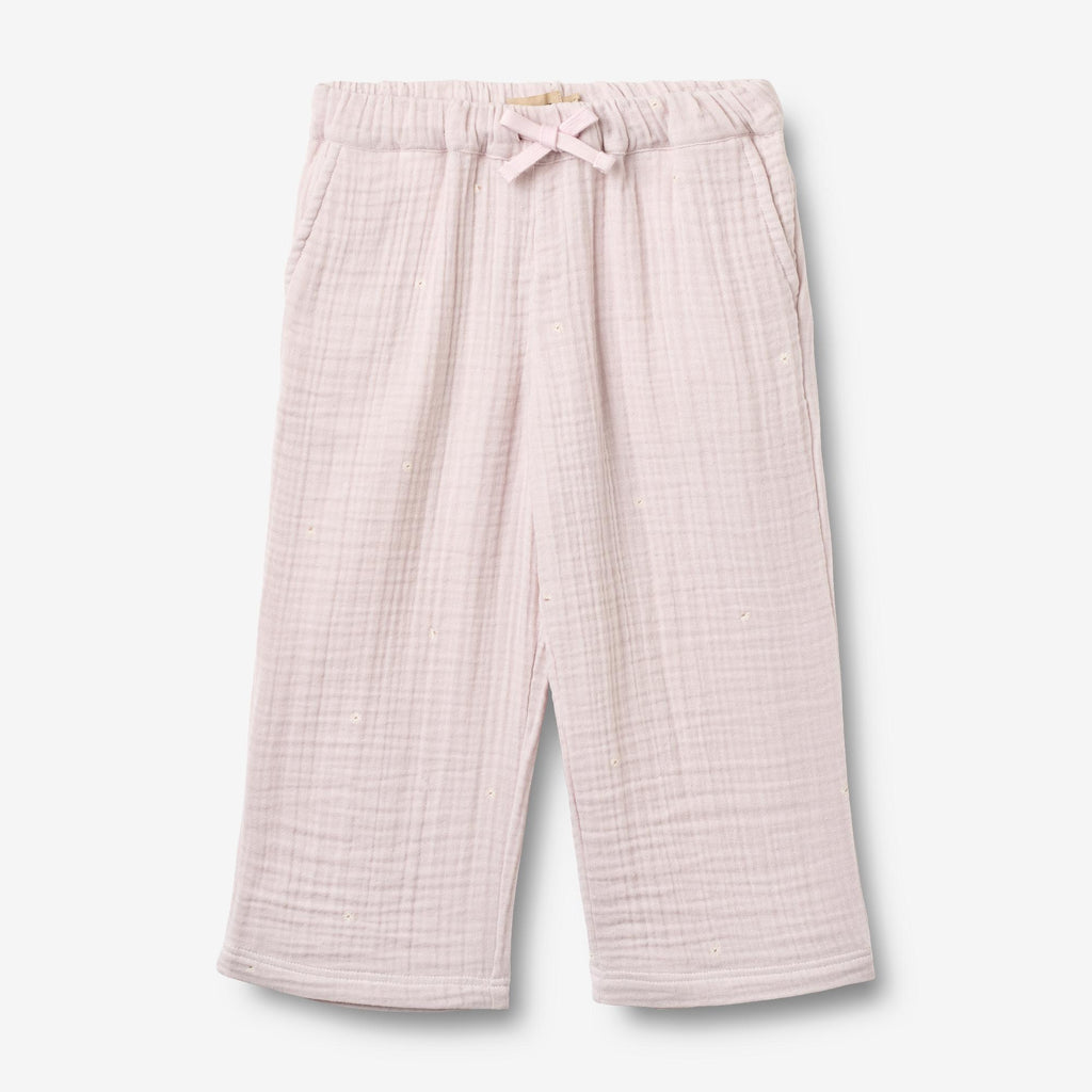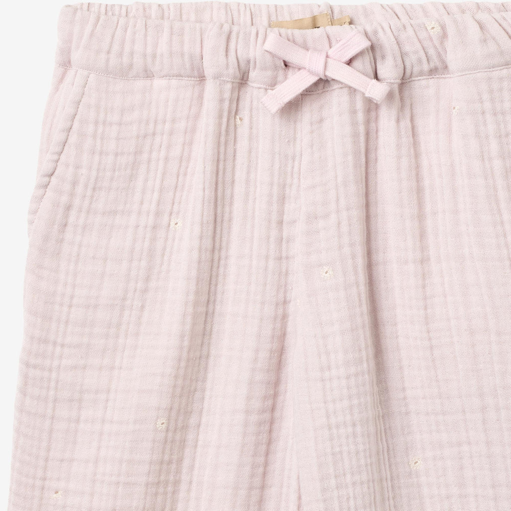 Bløde bukser med print i økologisk bomuldsgaze til børn.- Normal/løs pasform- Sidelommer- Justerbar elastik i taljen- Flad snørebånd foran- Brede ben- Baglomme med mærkemærke- Trykt krøllet gazeDisse bukser er en væsentlig del af dit barns daglige påklædning med en praktisk elastik i taljen og sidelommer. Den afslappede pasform gør bukserne behagelige for dit barn at have på og kan nemt styles med en af vores T-shirts, toppe eller strik til hverdagen.