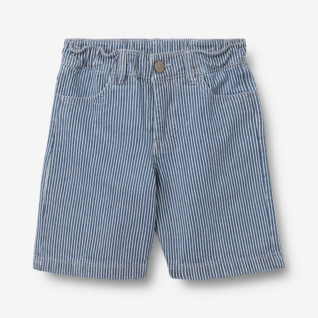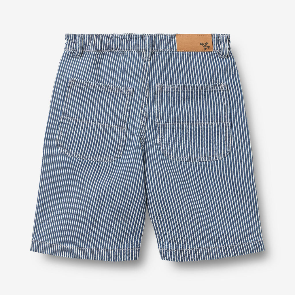 Behagelige stribede shorts i kraftig denim til børn. - Almindelig/løs pasform- Sidelommer- Justerbar elastik indvendig i taljen- Lynlås og en metalskruknaps lukning- Søm flyttet let fremad - Bæltestropper- Lommer med skæring bagpå- Patchmærke - Stribet denimFede denim shorts er en vigtig del af dit barns daglige beklædning med en praktisk elastik i taljen og lommer. Shortsene har en løs og afslappet pasform omkring benene, hvilket gør shortsene behagelige for dit barn at have på og kan let styles med en af vores T-shirts, toppe eller strik til hverdagen.