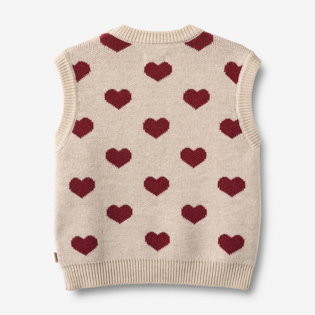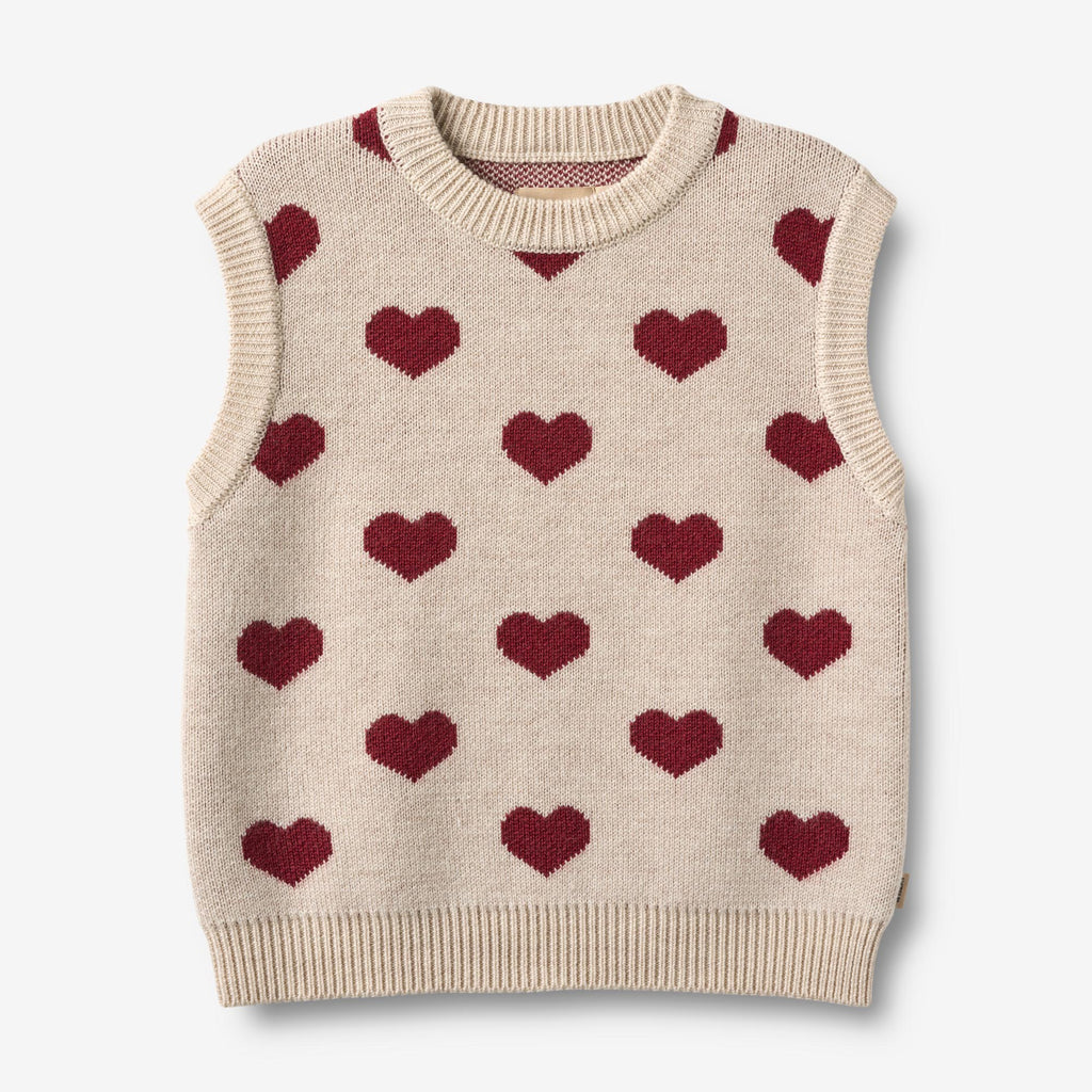 Strik julevest i blødt merinould til børn. - Løstsiddende - Lav skuldersøm og store ærmehuller- Ribkant i halsudskæring samt nederste kant- Unikt mønster med hjerterWheats strikvest er et must, når vinterkulden nærmer sig. Vesten er perfekt udover en basis t-shirt, skjorte eller kjole, og passer desuden også skønt sammen med et par leggings, pæne bukser eller nederdel. Om det er til julefest eller hygge i det lille hjem, kan vesten bruges til enhver lejlighed som et ekstra lunt lag.
