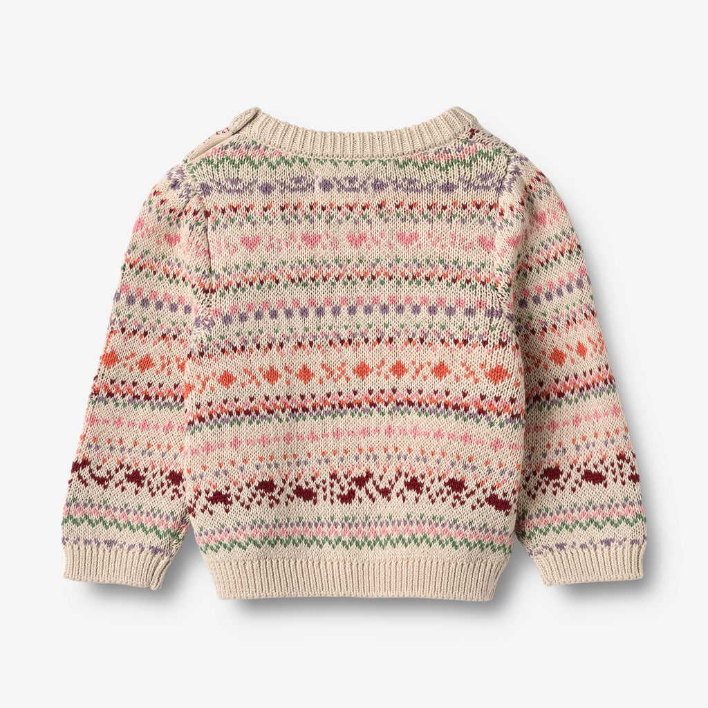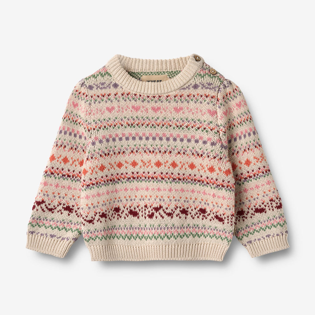Langærmet striktrøje i blødt økologisk bomuld til din baby. - Normal/løs pasform- Raglanærmer- Rib ved halsudskæring, manchetter og forneden- Åbning ved venstre skulder- Unikt jacquardmønsterWheats strik er en sand klassiker i de evigt skiftende årstider, da den er blød og behagelig at have på uden nogen form for kløe. Vores strikkede pullovere har et klassisk look med en afslappet pasform, der gør det nemt at style med et par leggings eller over en kjole alt efter vejr og anledning.
