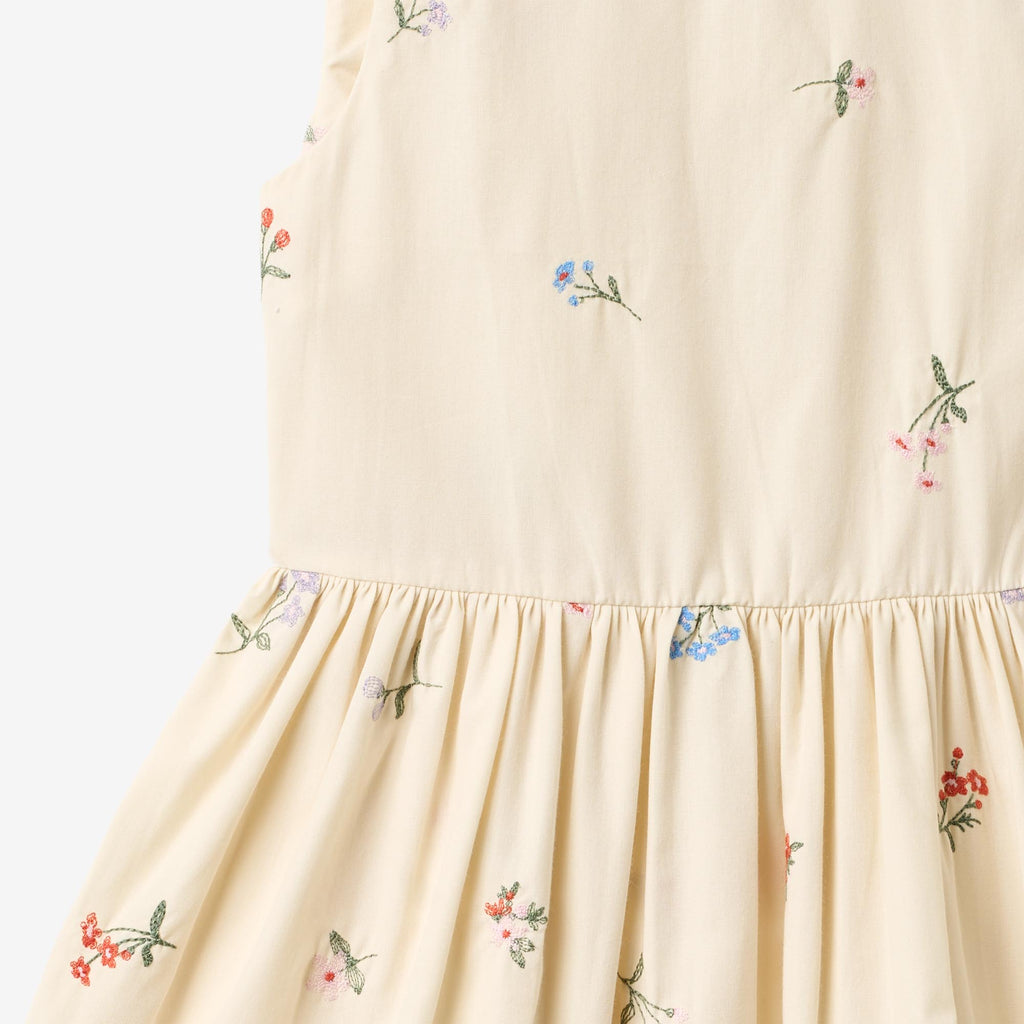 Ærmeløs kjole med broderi i blød økologisk bomuld til børn.- Længde: Over knæene- Let foret indvendigt i overdel- Bærestykke i taljen med samlinger nedenfor- Knaplukning bagpå- Unikt broderiEn vævet sommerkjole er uundværlig til solrige dage. Let, luftig og designet til sommerens varme eventyr. Med delikate detaljer fanger denne kjole sommerens essens, uanset om det er til hverdagsleg eller særlige lejligheder.