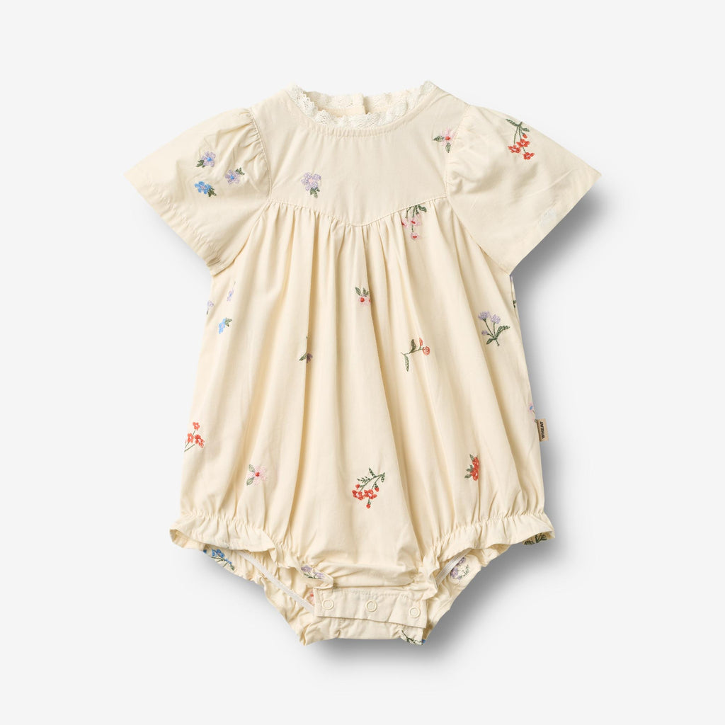 Kortærmet sparkedragt med broderi i blød vævet økologisk bomuld til babyer.- Sød bomuldssnøre i halsudskæringen- Pufærmer- Lægning over taljen med rynk under- Elastiskærmer og nederste kant- Samlinger på skulder og løstsiddende ærmer- Knaplukning bagpå og trykknapper i skridtet- Vævet broderiblomsterDisse bløde og åndbare sommersparkedragter er en charmerende nødvendighed i din babys sommertøjskollektion. Designet med komfort for øje har de en løs pasform, der giver mulighed for bevægelse og leg. Den lette vævede bomuldsstof holder din baby kølig på solrige dage, mens de praktiske trykknaplukninger sikrer nem påklædning og skift.