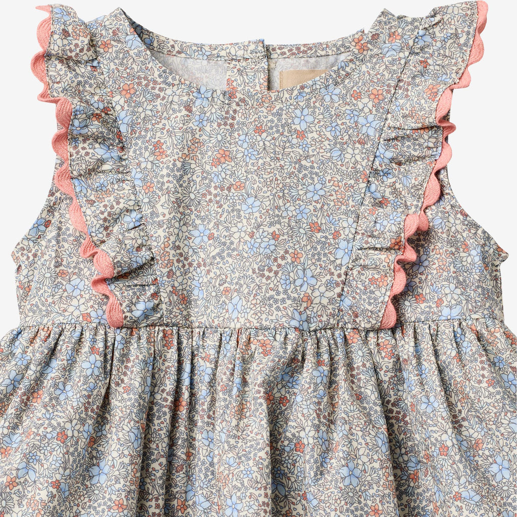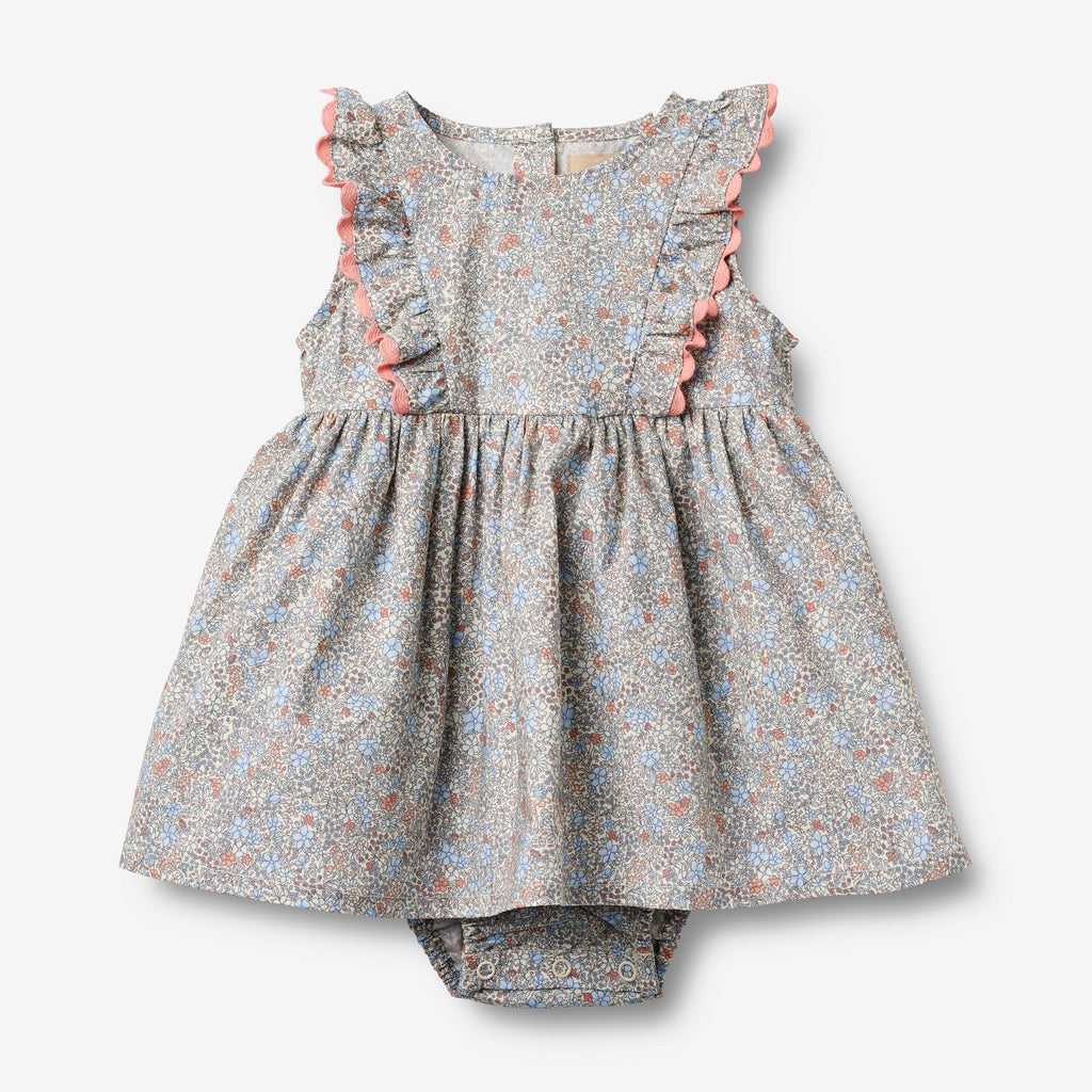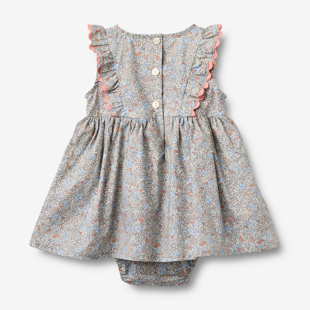 Ærmeløs dragtsæt med print og snørredetaljer i blød vævet økologisk bomuld til babyer.- Skæring ved taljen med samlinger nedenunder- Ruffles ved ærmekanten- Lille bomuldssnøre ved ruffles- Knaplukning bagpå- Trykknaplukning i skridtet- Sødt signaturprintDisse dragtsæt er både søde og behagelige at have på og bevæge sig i. Dragtsættet er praktisk, da det er en kombination af en løstsiddende kjole med bunden af en klassisk bodystocking indenunder.