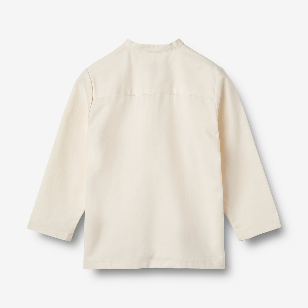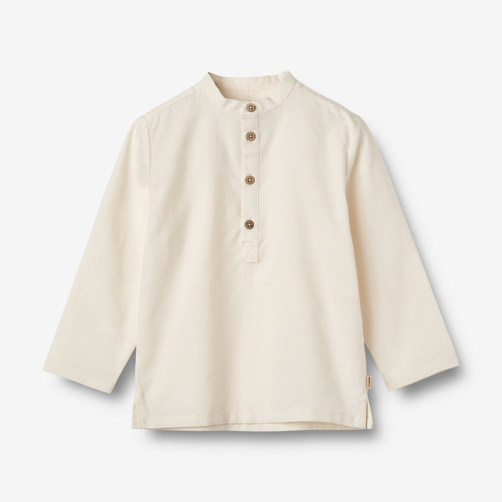 Langærmet skjorte uden krave i blødt økologisk bomuld til baby.- Almindelig pasform- Knapper halvvejs ned foran- Mandarinkrave- Ingen manchetknapper for et mere afslappet lookWheats klassiske skjorte med mandarinkrave er som skabt til julens festligheder. Det tidløse design gør den både elegant og behagelig – perfekt til julemiddage og hyggelige sammenkomster. Style den med et par bukser eller under en strikvest for et ekstra festligt look, der emmer af julens magi.