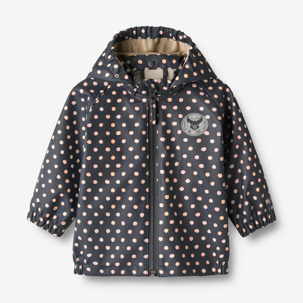 Wheats praktiske regntøj er en væsentlig del af dit barns garderobe. Jakken er lavet i et superblødt og let materiale, der gør den behagelig for dit barn at have på og bevæge sig rundt i. Den er vandtæt og smudsafvisende, og er derfor nem at rengøre med en våd klud efter en mudret eftermiddag på legepladsen.