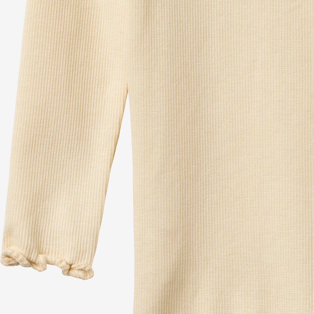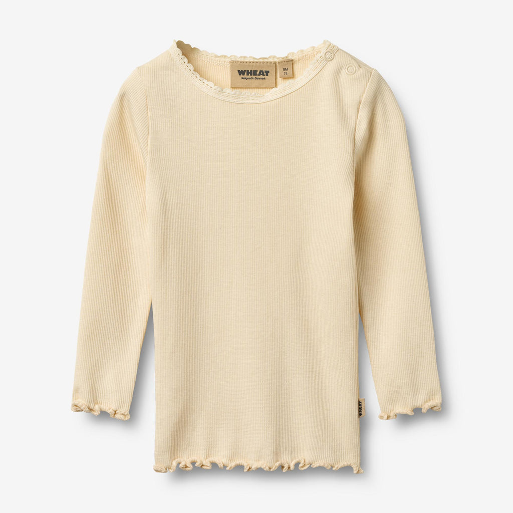 Langærmet rib T-shirt i en blød blanding af økologisk bomuld og Lenzing modal til baby.- Slimfit for tæt pasform- Blonde i halsudskæringen- Overlockede detaljer ved håndled og i kanten forneden- Trykknapper på den ene skulder for bedre komfort- RibstrukturWheat's t-shirts er skønne at have i garderoben, da de er bløde og yderst behagelige at have på for det lille barn. Disse t-shirts kan nemt og enkelt styles på tværs af kollektionen, om man ønsker at sætte overdelen sammen med små shorts, et par leggings/bukser eller under en kjole afhængigt af behov.