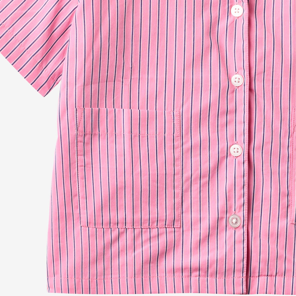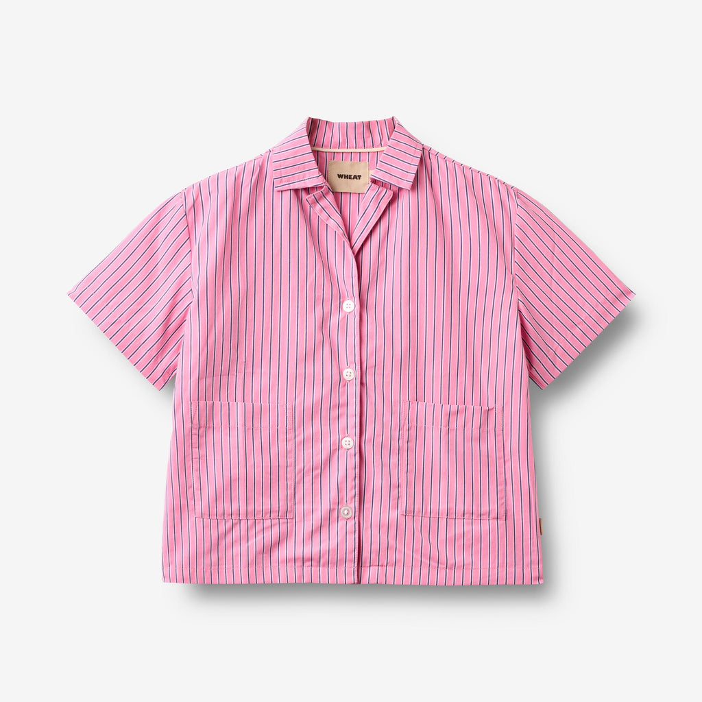 Stribet kortærmet skjorte i blødt økologisk bomuld til børn.- Bred/løs pasform- Pyjamas krave- Skuldersøm flyttet lidt fremad- Knapper ned foran- Åbne frontlommer med lappesyninger i trekantsmønster- StribetWheats skjorter er unisex og perfekte til både særlige lejligheder og hyggelige dage. Skjorten er behagelig at have på med en afslappet pasform og knapper ned foran. Skjorten giver outfittet et mere klassisk look, og du kan let style den med et par bukser og en strik for at fuldende looket.
