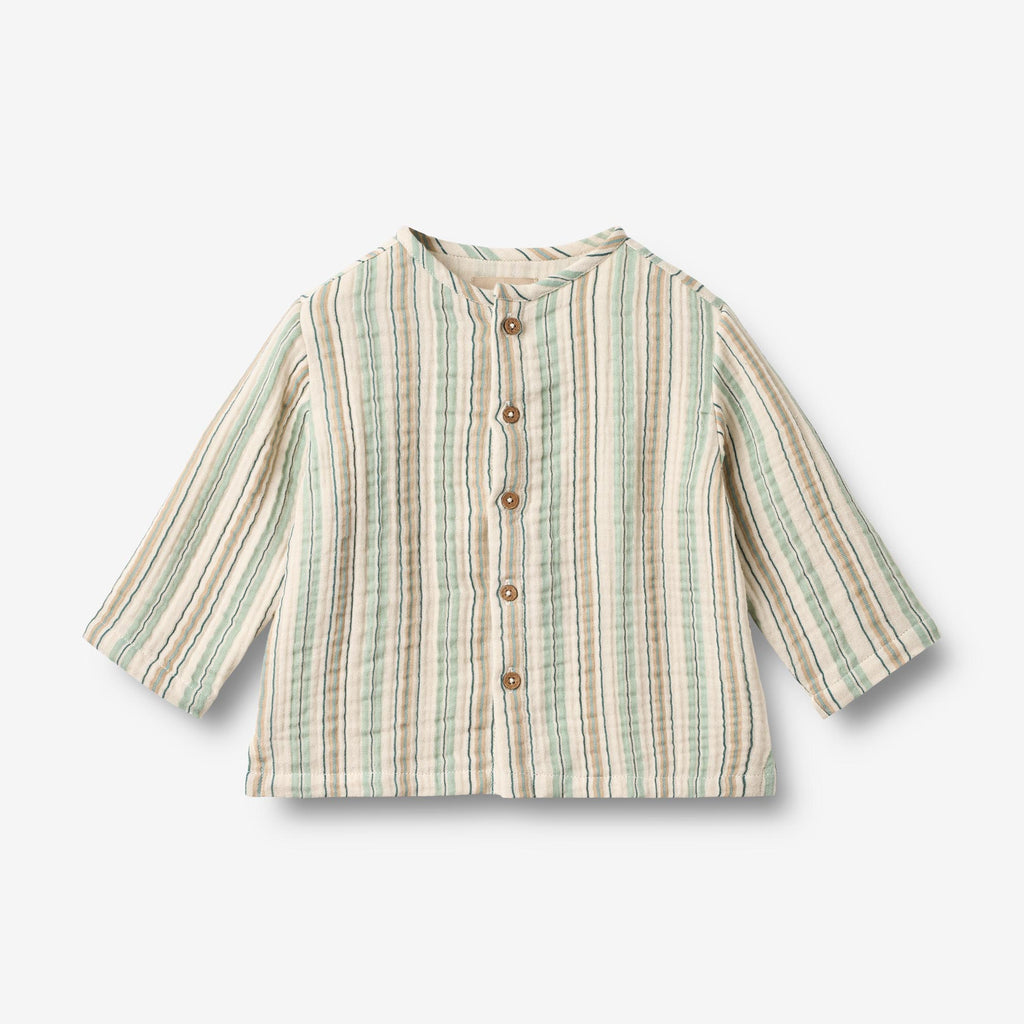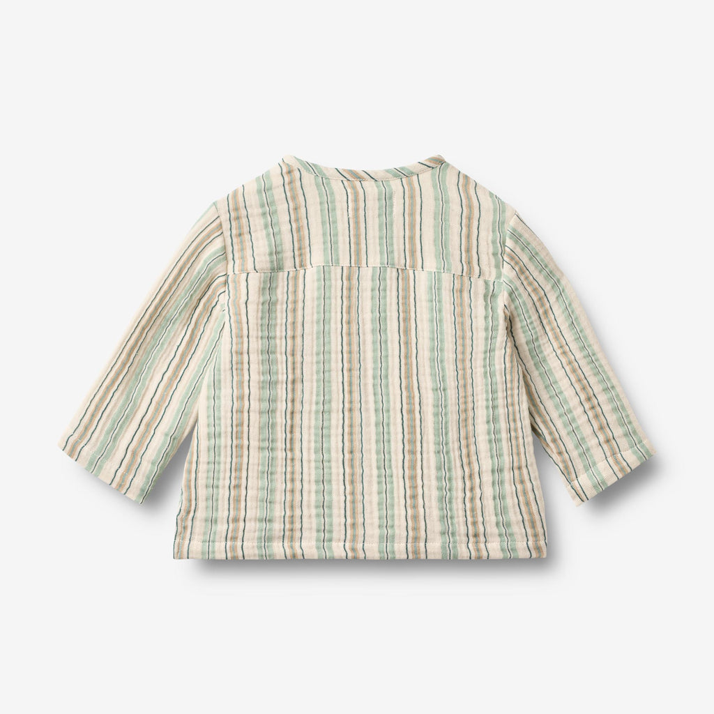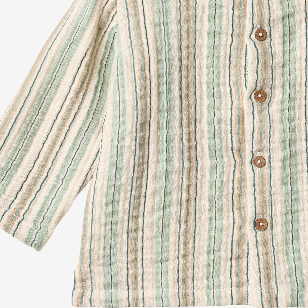 Langærmet skjorte med striber i blødt økologisk bomuld til babyer. - Almindelig pasform- Knapper ned ad fronten- Uden krave og manchetter for et afslappet look- Stribet gaze stofDisse skjorter er unisex og er perfekte til mange særlige lejligheder og hyggelige dage. Skjorten er behagelig at have på med en afslappet pasform og knapper ned ad fronten.