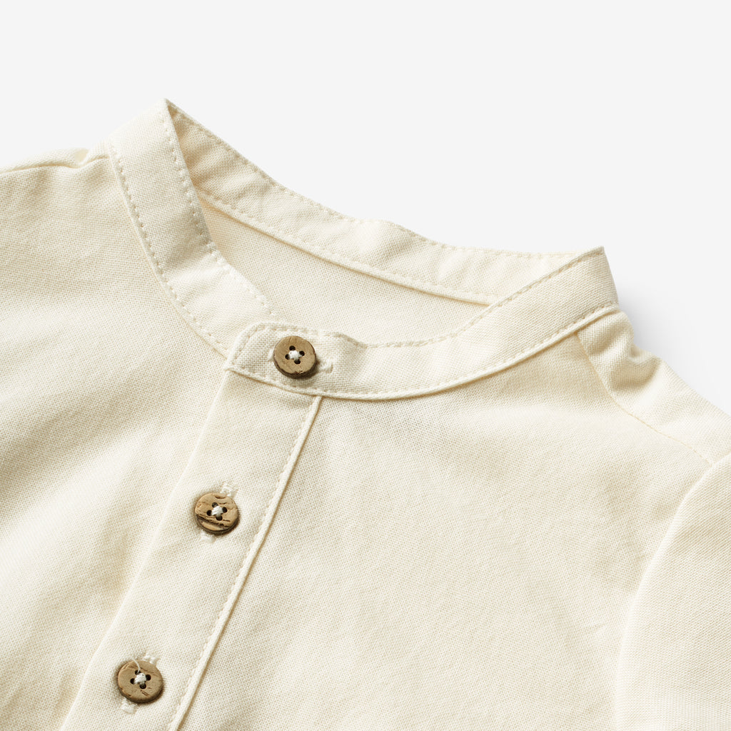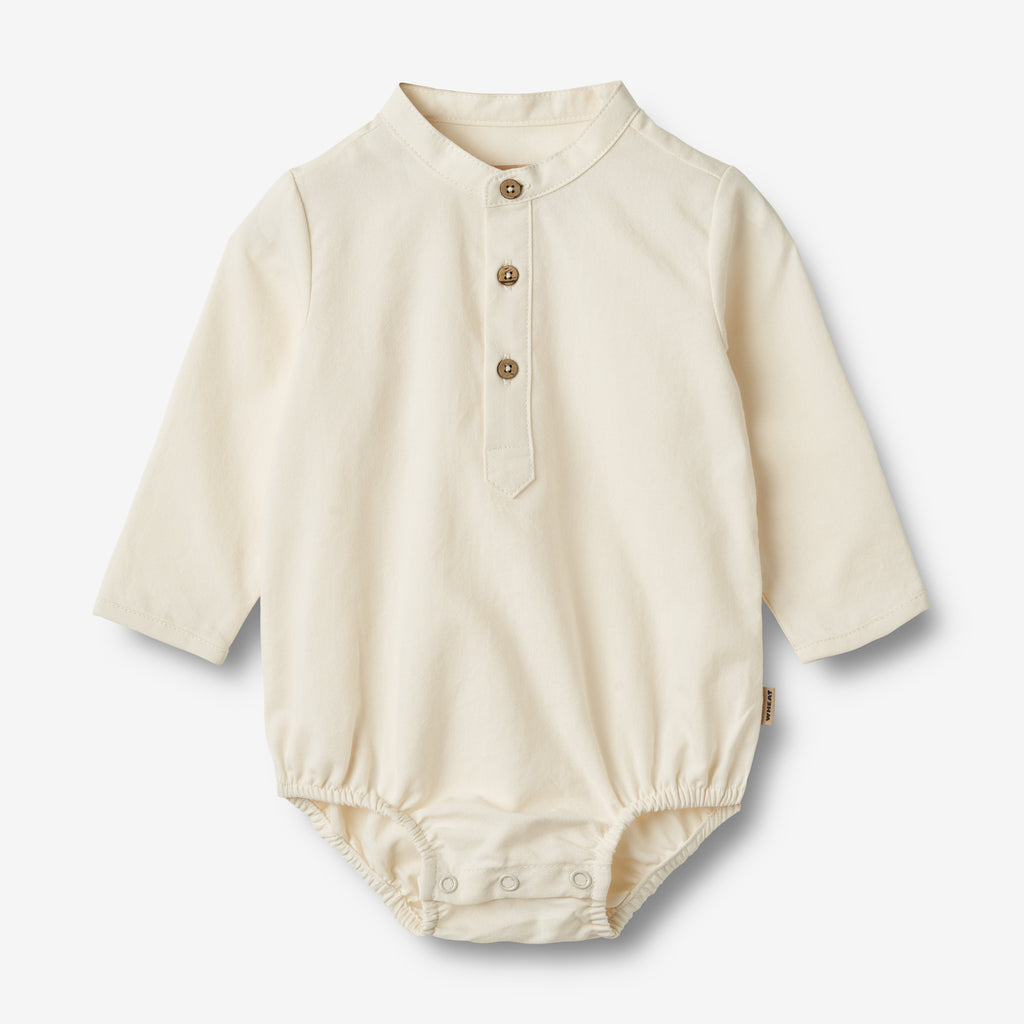 Langærmet skjortebody i økologisk vævet bomuld til din baby.- Normal pasform- Mandarinkrave- Knaplukning ned til midt på brystet- Elastik i lårene- Trykknapper i bundenWheats fine skjortebodyer er essentielle til de helt små, når der er en fin anledning i sigte. Dragten har en løs pasform, som gør den behagelig for din baby at have på. Den har elastik i benene, så den sidder til omkring lårene, samt trykknapper for bedre komfort når du skal iklæde din baby.Style denne dragt med en ærmeløs body indenunder samt et par pæne bukser til for at fuldende det søde look. Tilføj desuden en lille strik som et ekstra lag på de kølige efterårs- og vinterdage.