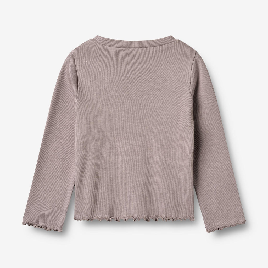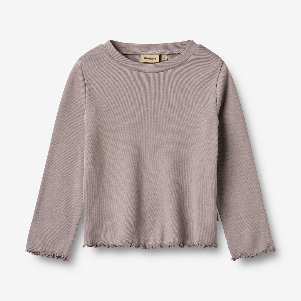 Langærmet rib T-shirt med brede ærmer i en blød blanding af økologisk bomuld og Lenzing modal til børn. - Almindelig/løs pasform - Overlockede detaljer ved håndled og i kanten rundt forneden- Ribstruktur Wheat's T-shirts er en god basis i dit barns garderobe, da T-shirtsene er bløde og behagelige at have på. De kan nemt matches med et par bukser eller en nederdel, eller med en strik udover afhængigt af vejr og anledning.