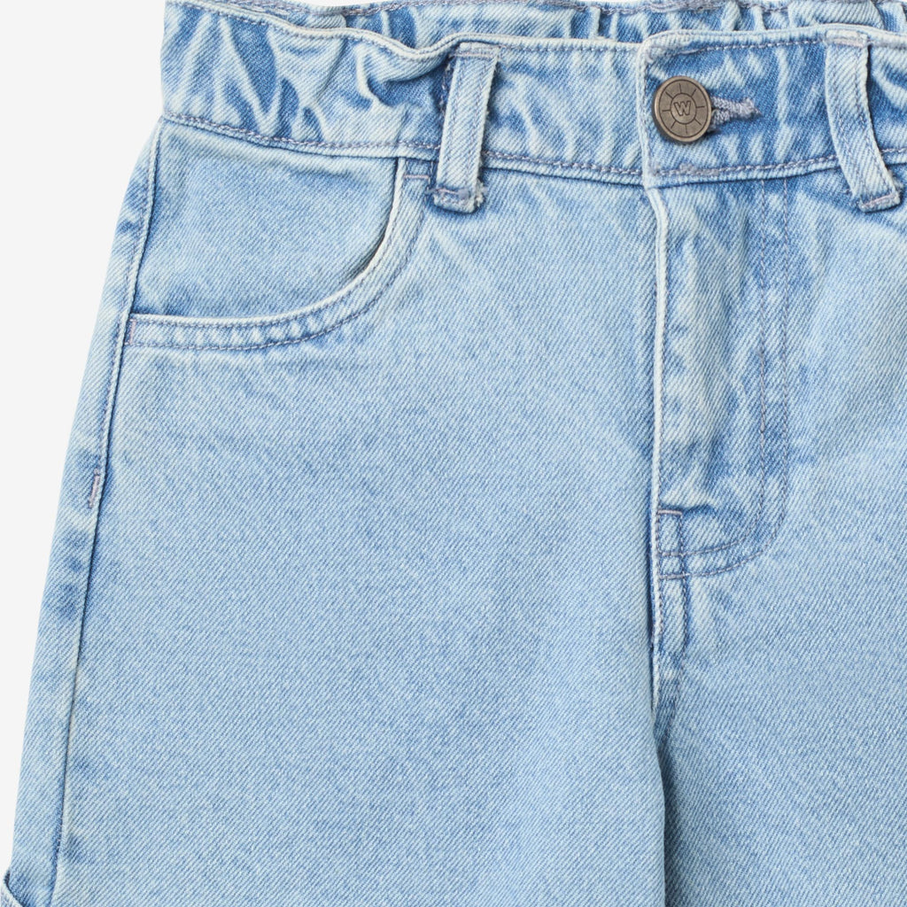 Cool denim jeans i økologisk bomuld til børn. - Justerbar elastik i taljen- Vidde ben- Sidelommer- Paspelommer bagpå- Gylp med lynlås og knapWheat's bukser bør være en fast del af dit barns daglige garderobe. Den afslappede pasform gør bukserne behagelige for dit barn at have på og de kan nemt styles med en af vores T-shirts, toppe eller strik til hverdag. De er også perfekte til specielle lejligheder, hvor du kan dresse dem op med en skjorte eller bluse for at fuldende det cool look.